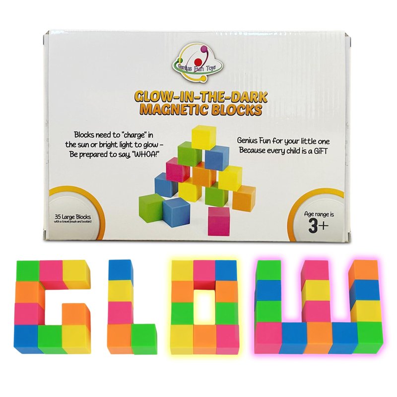 Genius Fun Toys Magnetic Blocks for Toddlers: Engage your child with these glow-in-the-dark magnetic building blocks for endless fun and learning! These toddler magnetic toys glow brilliantly in the dark, transforming playtime into a captivating experience - even in low light. Crafted with high-quality materials and safety in mind, these fluorescent STEM building blocks for toddlers 1-3 feature smooth, rounded edges and strong magnets for safe, hassle-free play while standing up to hours of building and unbuilding. These magnetic blocks for kids ages 3-5 are not just fun - they help foster critical thinking, problem-solving, spatial reasoning, and imaginative play, while nurturing STEM skills and fine motor development. Perfect for tactile exploration, these magnetic toys for toddlers 1-3 make excellent sensory-friendly toys for creative learning. The building sets for kids include 35 magnetic cube blocks (1.38 x 1.38 x 1.38” each), a travel pouch, and an instruction manual - making it the ideal educational gift for children ages 3 and beyond. These sensory building blocks are designed for creativity, imagination, and skill-building, which makes them a perfect addition to any toy collection! About Us: Genius Fun Toys is a small, USA-based, and family-owned business. We love designing convenient and thoughtful products like these Montessori magnetic blocks that you can use in your daily life for your children. This set of kids magnetic building blocks is an effort to do just that. We hope you love our building blocks for kids ages 4-8 as much as we do. Thank you for supporting our family business!