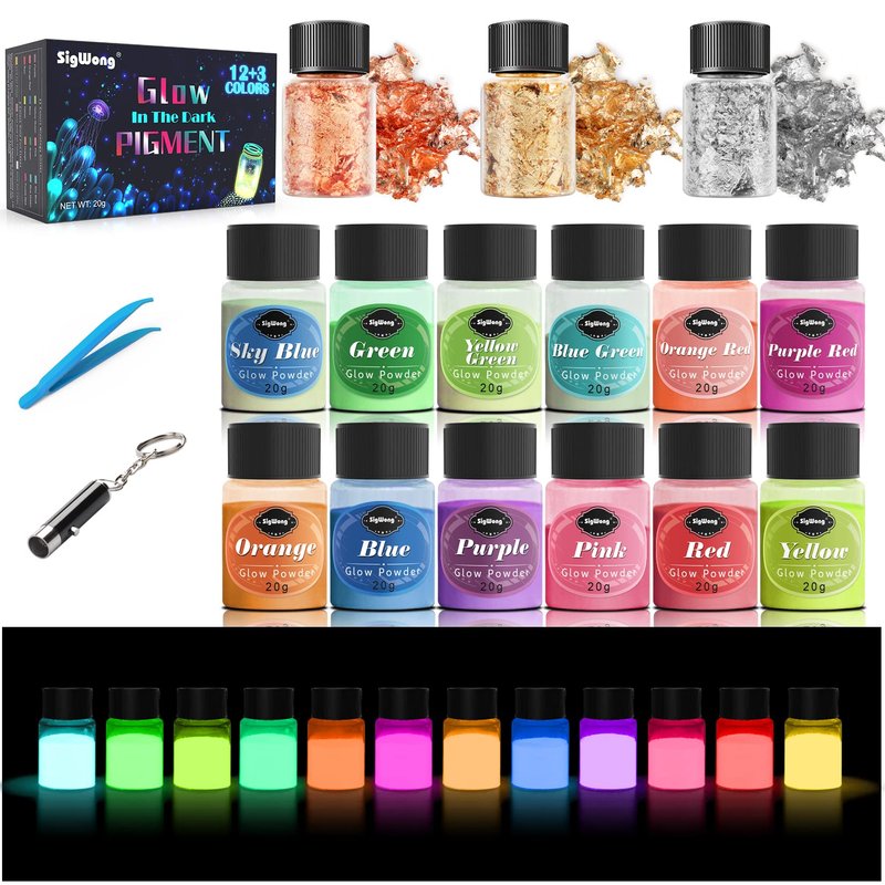 - Elaborate Collocation: This set includes 12 colors of glow in the dark pigment powders (20g each), 3 colors of gold foil flakes (2g each), and 1 tweezers. A variety of color options let your imagination run wild, which is perfect suitable for both beginners and professionals.