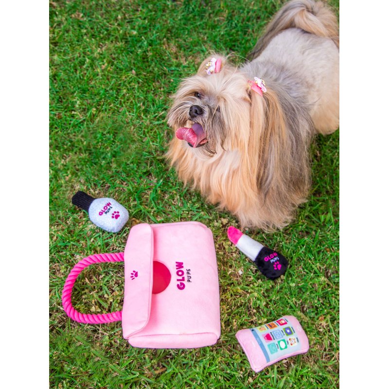 Glow Pups Hide and Seek Dog Toy Set, Pink Purse with Plush Toys, Squeakers, Crinkle Material, Rope Handle, for Small Dogs (Pink Purse Dog Toy with Lipstick, Cell Phone and Nail Polish Toys)