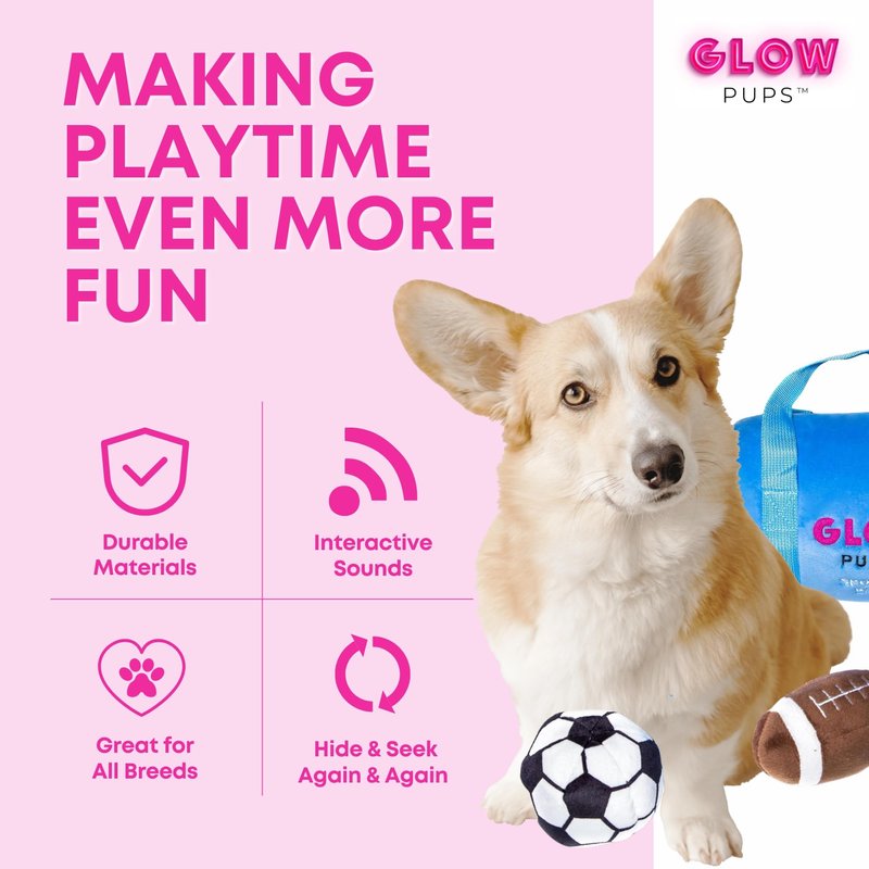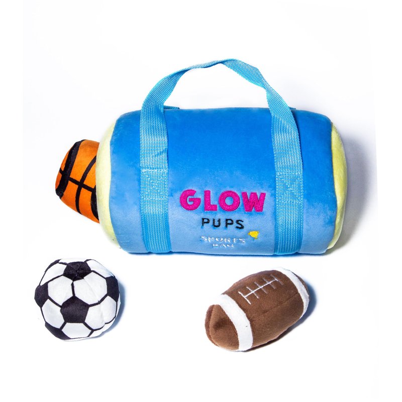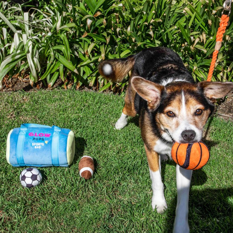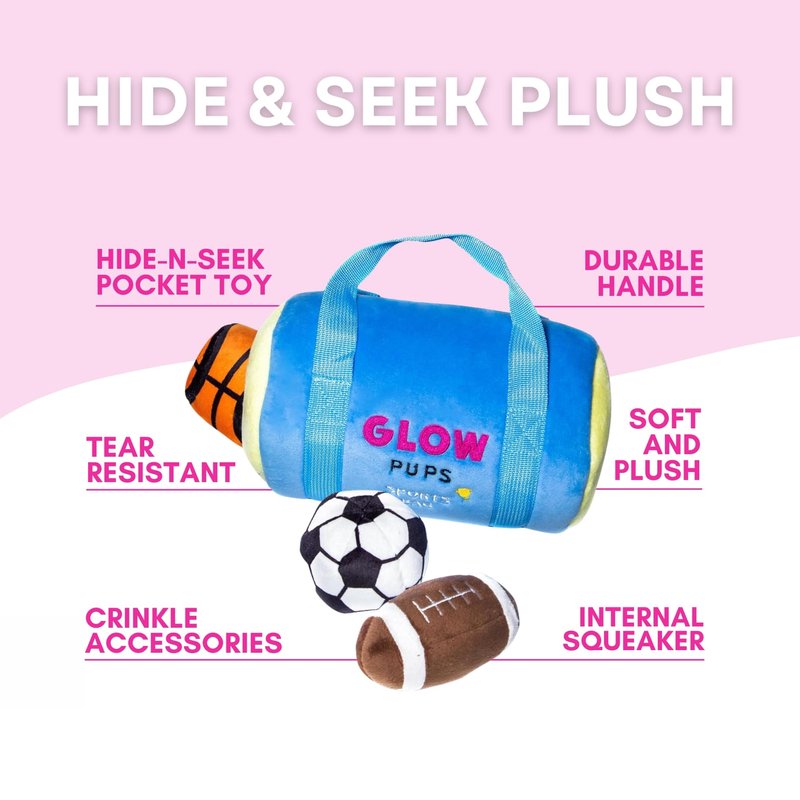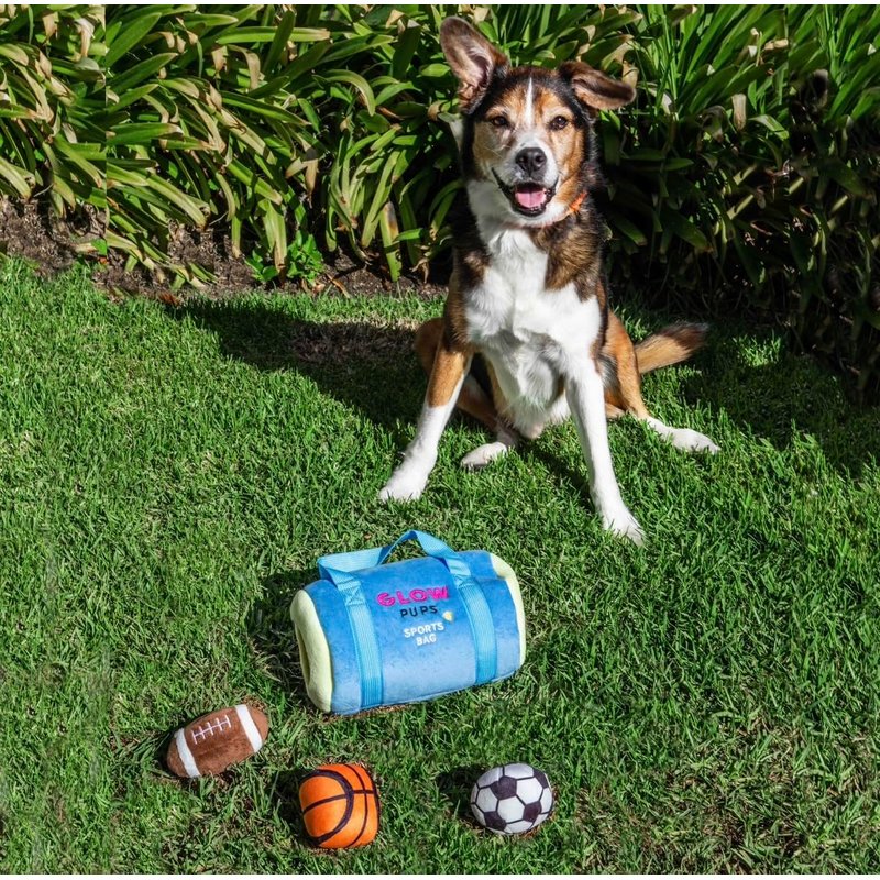 Glow Pups Sports Bag Hide and Seek Dog Toy, 3 Plush Balls with Squeakers, Basketball, Soccer Ball, Football