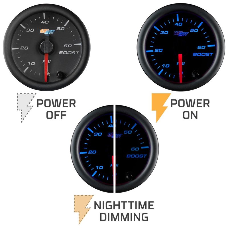 - GlowShift Black 7 Color Series 60 PSI Boost Gauge is Designed to Monitor Boost Pressure Levels of Your Diesel Truck's Turbo or Supercharged Engine