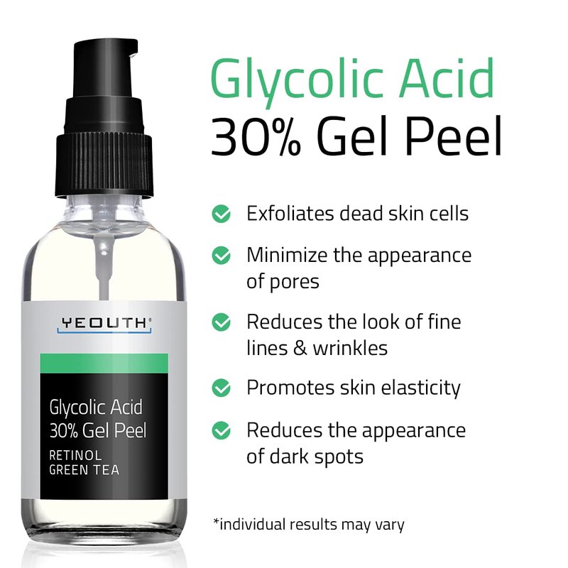- YEOUTH Glycolic Acid 30% Professional Gel Peel with Retinol & Green Tea. Made in the USA! Owned by a Cosmetic Chemist. Natural, Paraben-free. Dermatology Tested. ALL your skin needs from our fountain of YEOUTH! Add this gentle peel to YOUR skin care!