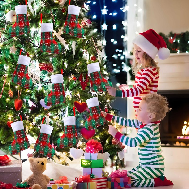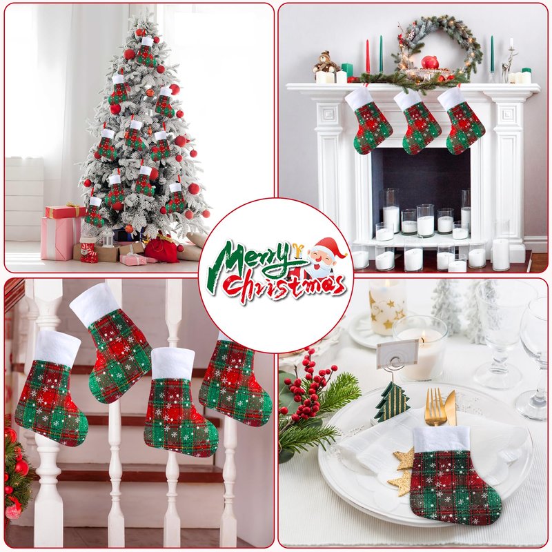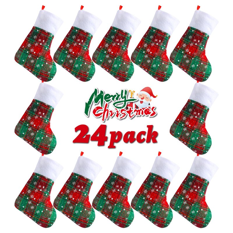 GlyinnHe 24Pack Mini Christmas Stockings, 7 Inch Buffalo Plaid Stocking Snowflake Red Green Stockings with Plush Cuff for Christmas Tree Ornament Decorations Gift Holder