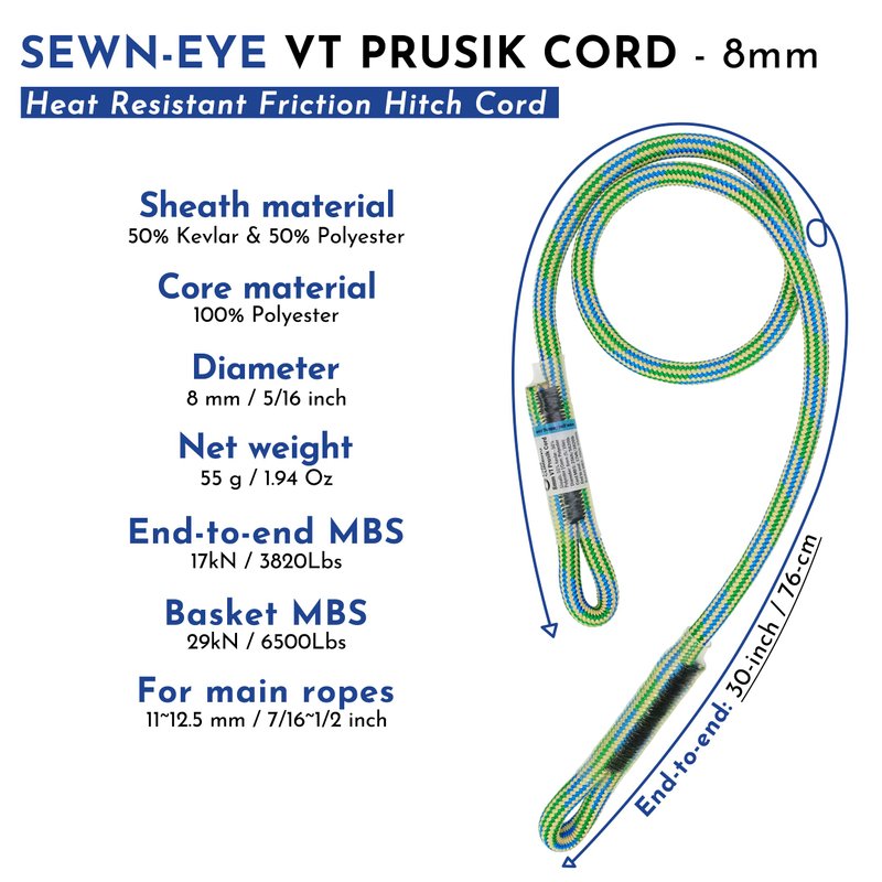 - VT Prsuik with Heat Resistance! 50% Kevlar Fiber is mingled during sheath braiding, adding durability (cord rating to 25kN) and excellent heat resistance for your friction hitch.