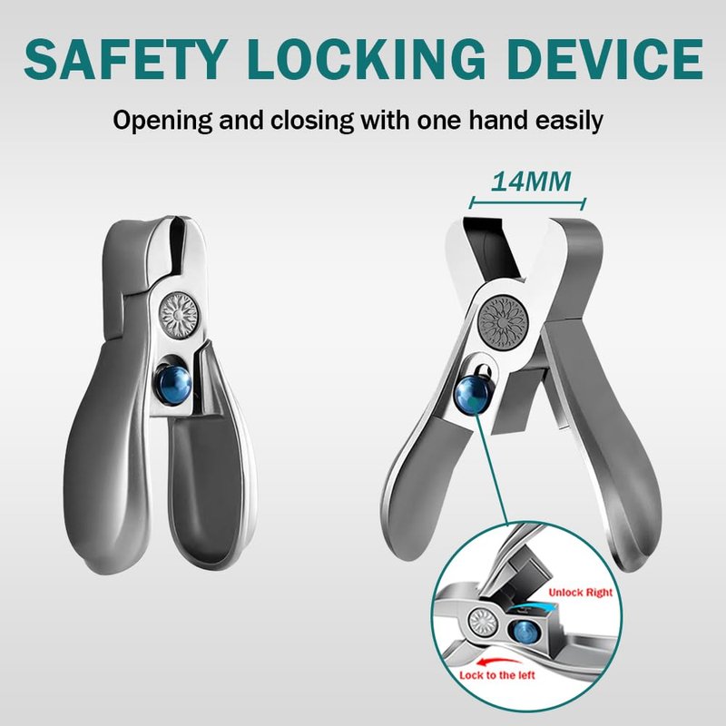 - 【Trim Your Nails Safely 】No more risky struggles with traditional nail cutter tools, our finger nail clipper is designed for great control and ease of use, can be operated single-handedly. Simply push the blue side lock down to release and unlock. Once unlocked the nail trimmer, you'll be amazed by the 14mm super-wide opening, easily handle the thicker or harder nails. Push it up to secure the jaw after ues, ensuring secure storage when not in use.