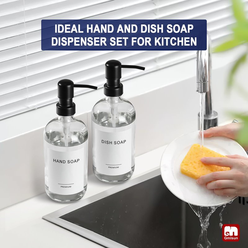 - 【EXQUISITE CLEAR GLASS SOAP DISPENSER WITH PUMP】 With the latest stylish round exterior, the exquisite clear glass and the matte black pump, GMISUN’s clear soap dispenser emits class and uniqueness. This hand and dish soap dispenser set would be the perfect modern decorations for your kitchen and bathroom. They will complement the other shabby chic, vintage, farmhouse, and rustic decors in your home and together they will showcase the aesthetic you are looking for.
