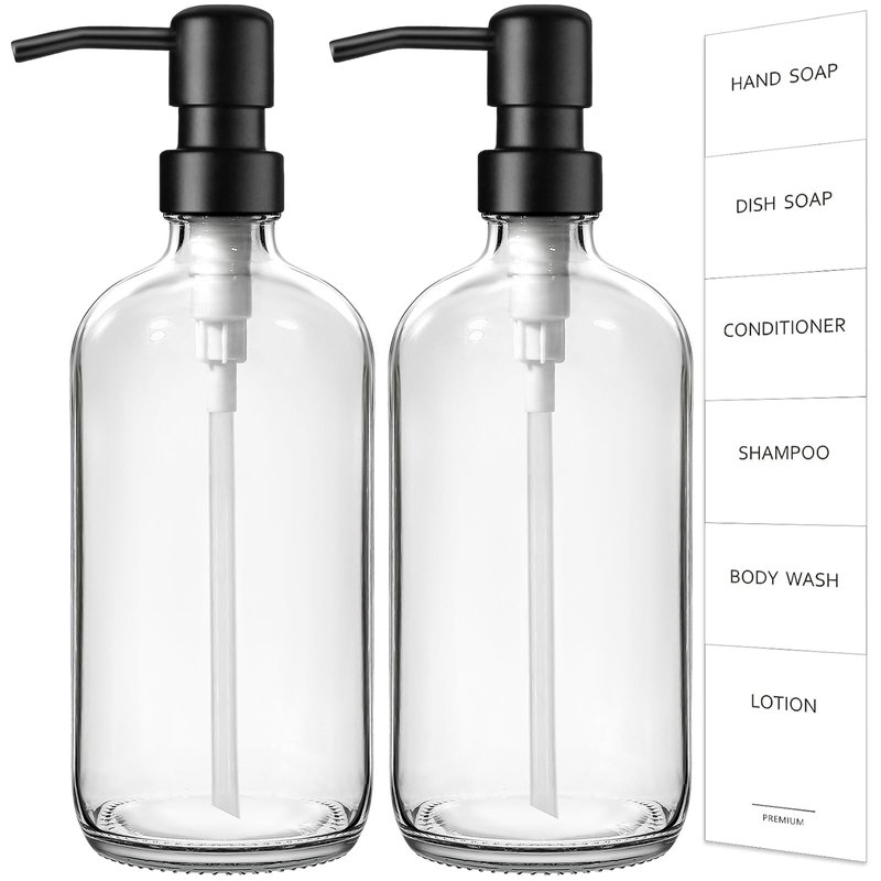 GMISUN Glass Soap Dispenser with Pump, 2 Pack Clear Bathroom Hand Soap Dispenser with Stainless Steel Pump, 16 Oz Refillable Kitchen Hand and Dish Soap Dispensers Set, Modern Liquid Pump Bottles