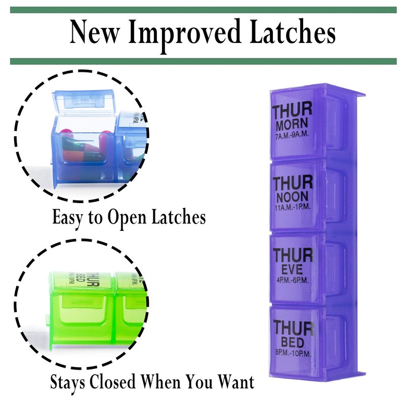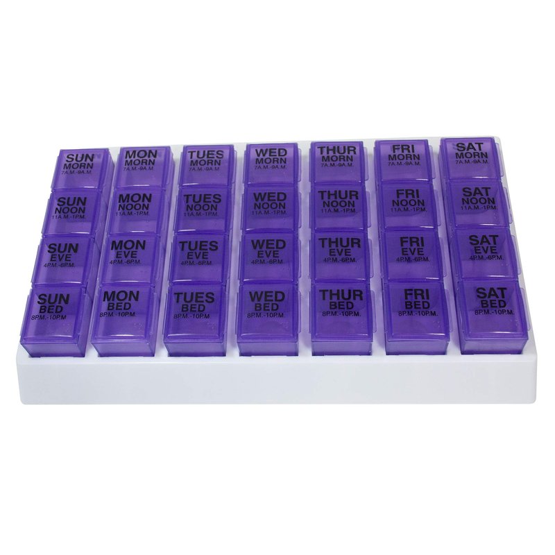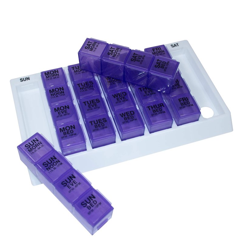 7 removable daily pill boxes securely snap into strong, heavy duty organizer tray All compartments open and close separately to prevent spilling and mixing medication times 4 compartments - One for each time of the day (Morning, Noon, Evening and Bedtime) Daily pill boxes snap in and out, allowing you to take just one day’s worth when on-the-go Product Dimensions: 10" x 5.5" x 1.8"