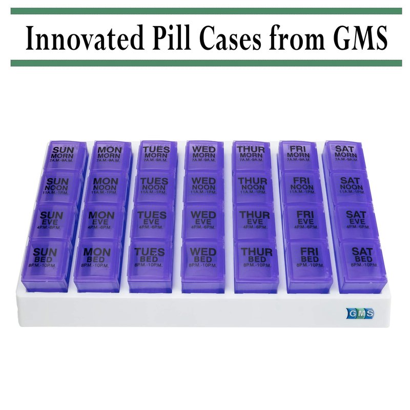 GMS 4 Times Per Day Weekly Slant Tray Pill Organizer – Includes 7 Removable Pill Boxes Designed to Protect and Remind That its Medication Time during Travel, Work and Any Other Daily Activity (Purple)