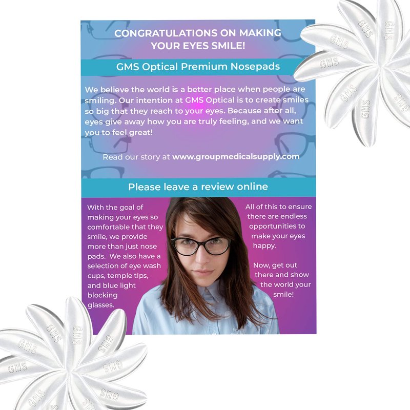 - » Don’t waste time and money on new glasses. Use GMS Optical Adhesive nose pads to revive your frames and bring new comfort and life to your glasses! These nose pads will make your glasses feel like new!