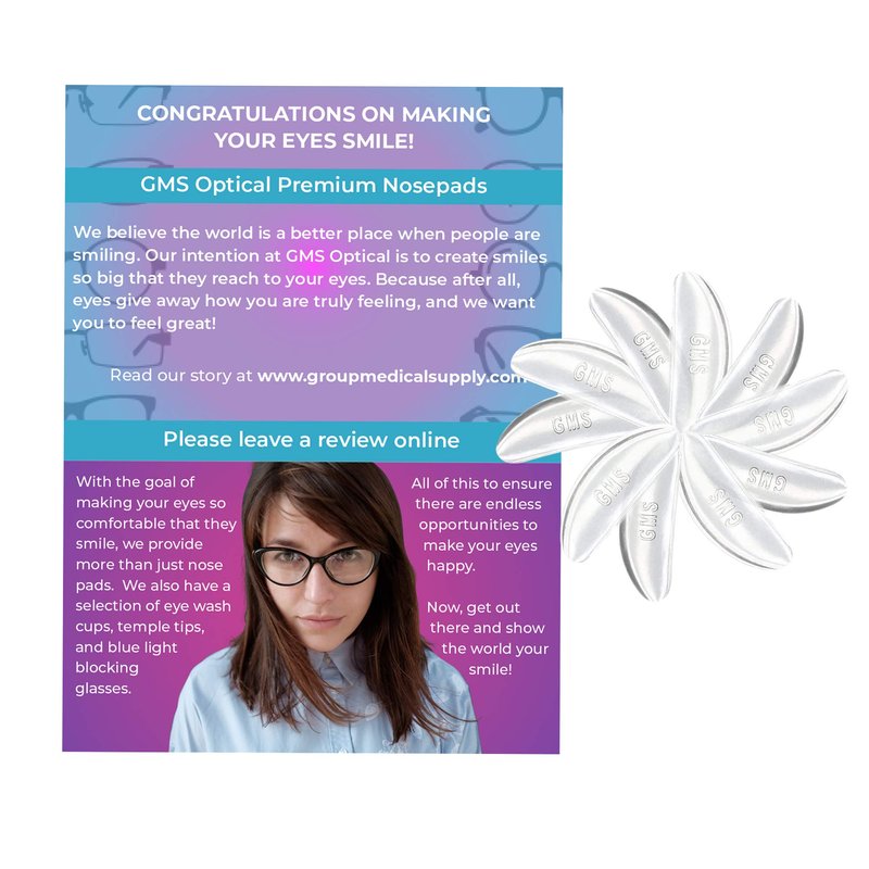 - » Don’t waste time and money on new glasses. Use GMS Optical Adhesive nose pads to revive your frames and bring new comfort and life to your glasses!