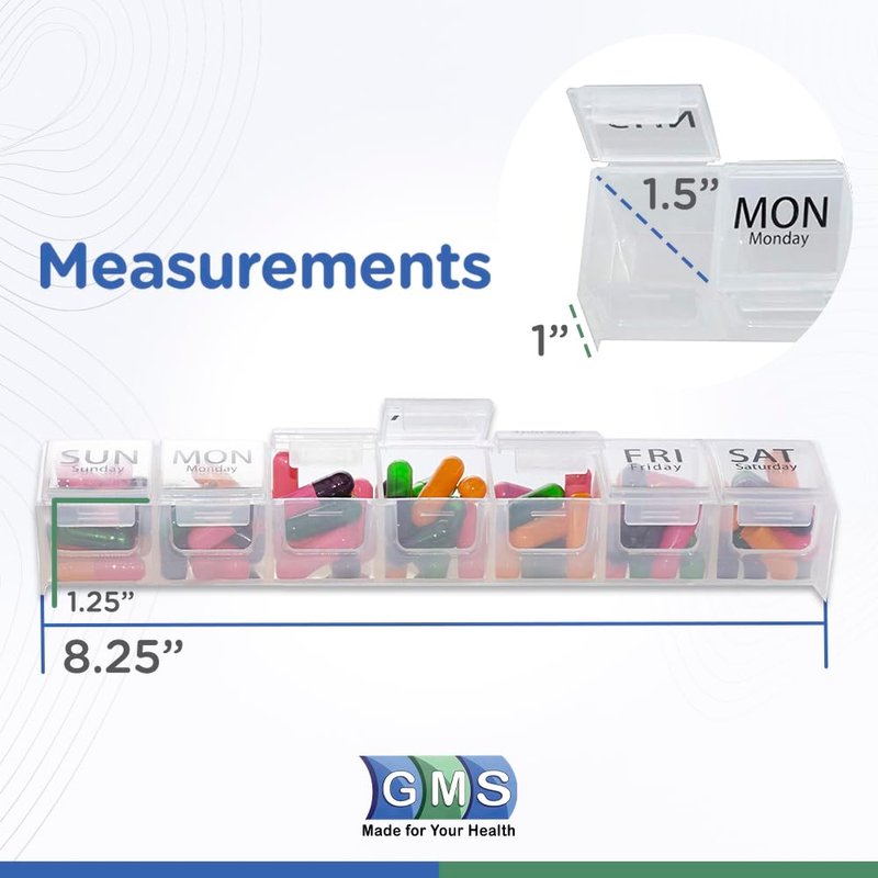 The GMS Weekly Pill Case – Clear offers a simple yet effective solution for organizing your weekly medication. With seven boldly labeled compartments, you can easily plan and prepare your medications for the entire week. Say goodbye to the hassle of sorting pills every day, and start each week knowing you’re well-prepared. Reliability is key when it comes to a pill reminder, and this case doesn’t disappoint. Its newly designed latch is stronger than ever, ensuring that your pills stay secure, providing you with a dependable solution for your medication management. The clear color of the pill case allows you to quickly and easily see the pills inside each compartment. This transparency simplifies the process of checking whether you’ve taken your medication for the day. You can confidently track your daily doses without any guesswork.