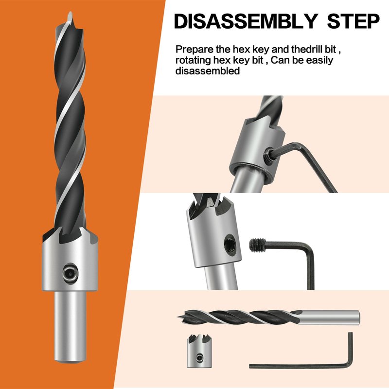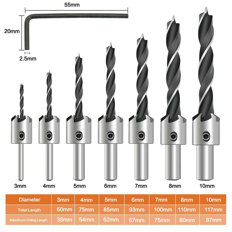- Meet Your Demands: Include 3mm, 4mm, 5mm, 6mm, 7mm, 8mm, 10mm and 1 free Hex Key Wrench, 7 pieces different sizes of countersink drill bits, satisfy you all demand. The most often used sizes for cabinet, furniture makers and other wood working