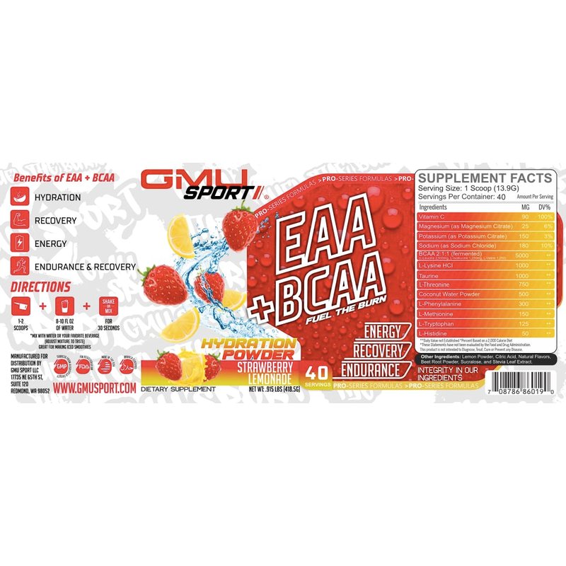 GMU SPORT - BCAA & EAA Hydration & Recovery Powder -Full Essential Amino Acids Profile Hydration Powder for Energy, Fast Recovery & Endurance - 40 Servings, Electrolyte Drink (Strawberry Lemonade)