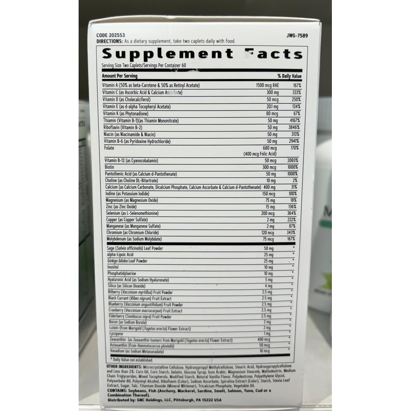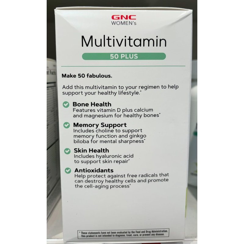 Nourish your body with GNC Women's Multivitamin 50 plus. This formula contains essential nutrients that help support bone, eye, and urinary health. In addition, it promotes increased energy. Everything in this multivitamin works together to help you stay strong as you age. This multivitamin includes nutrients needed to sustain energy levels and memory. Formulated with choline, B6, B12, folate, and Ginkgo Biloba to help support memory function and mental sharpness. Created for women over 50, packed with extra doses of vitamins and minerals that support your bone health, including vitamin D plus calcium and magnesium. It also contains hyaluronic acid, which delivers a potent amount of hydration to help restore skin elasticity and repair signs of aging. Our new, advanced formula promotes healthy aging and optimizes your vitality. Gluten-free, with no artificial colors, flavors, wheat, or dairy, and easy to swallow. As a dietary supplement, take two caplets daily with food. For over 85 years, GNC has been the leading global health and wellness brand providing the best in performance inspired nutrition. We are committed to meeting the highest standards while applying the most up-to-date advances in nutritional science. Above all else, GNC aims to inspire people to live well. ^In a randomized, double-blind, placebo-controlled study of 112 healthy volunteers, subjects taking the GNC vitamin and mineral blends for six weeks experienced significant improvements in serum levels of certain key nutrients compared to a placebo and a basic multivitamin formula based upon multivariate statistical analyses of a group of B vitamins (thiamin, niacin, riboflavin, pantothenic acid, biotin, folic acid and vitamins B-6 and B-12) and key antioxidants and carotenoids (a group of beta-carotene, alpha-tocopherol, selenium, lutein and lycopene). Statistically significant improvements in SF-36 Vitality and Mental Health scores were also observed compared to placebo. These statements have not