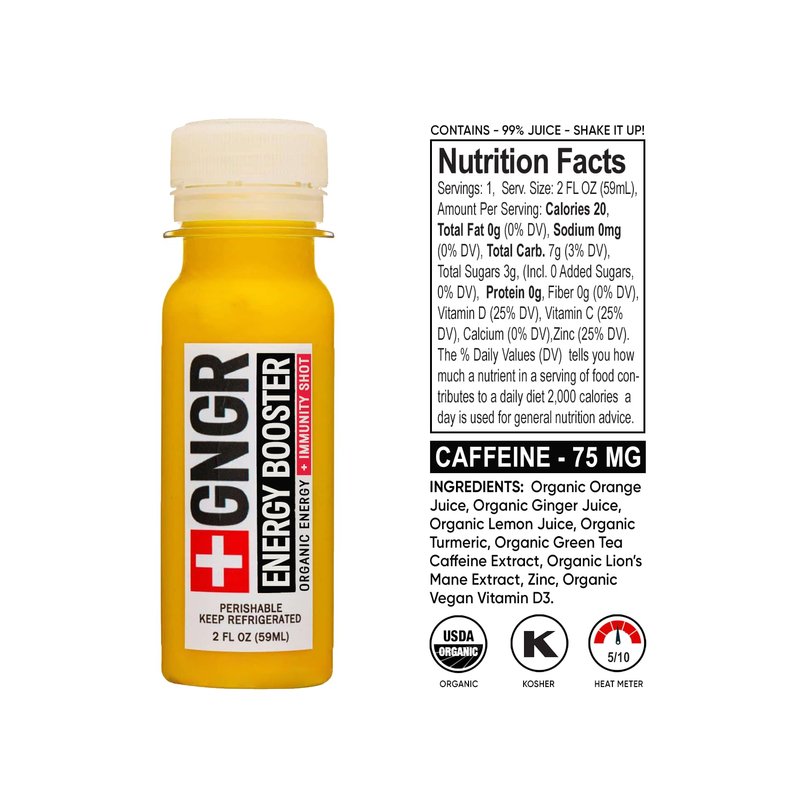 Revitalize your day with GNGR Energy Booster & Immunity Shot, a powerful blend crafted to energize and support your well-being. This cold-pressed ginger shot combines the invigorating benefits of freshly extracted ginger with the cognitive-boosting properties of Lions Mane Mushroom, creating a potent formula for both mental and physical vitality. Infused with 75mg of natural caffeine from green tea, it offers a smooth, sustained energy boost without the jitters, while turmeric root provides powerful anti-inflammatory support for overall immune health and digestive aid. Perfectly crafted as a convenient, all-natural solution, this shot is ideal for a refreshing and healthful start to your day. Elevate your energy and wellness routine with GNGR Energy Booster & Immunity Shot and enjoy the natural synergy of ginger, Lions Mane, caffeine, and turmeric in every delicious sip. Ingredients include Cold-Pressed Ginger Juice, Lions Mane Mushroom Extract, Green Tea Extract (75mg Caffeine), and Turmeric Root Extract. Shake well before use and enjoy one shot daily for optimal benefits. No added sugars, no artificial flavors, vegan, and gluten-free.