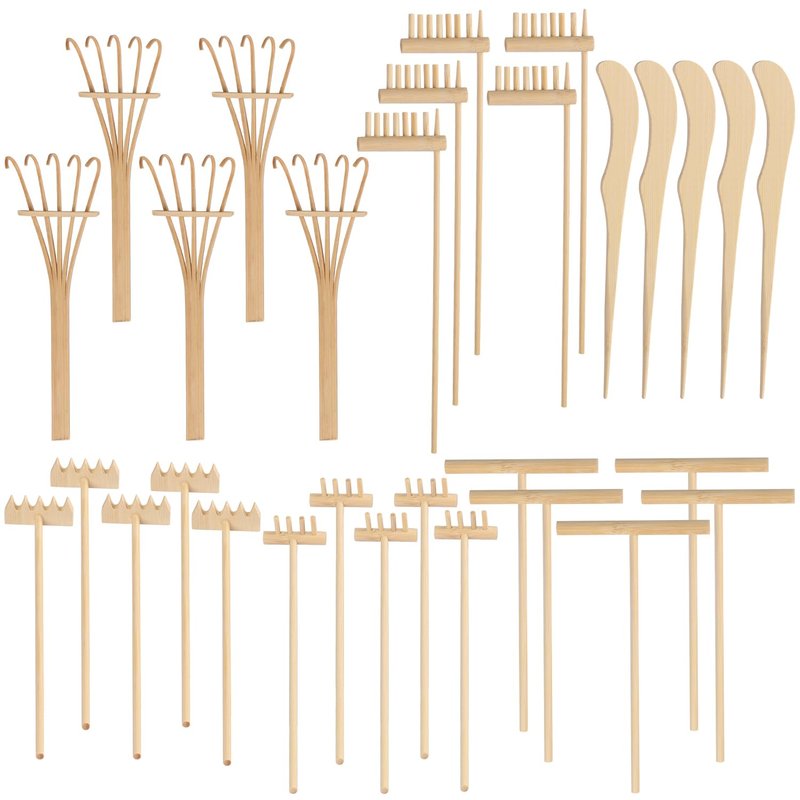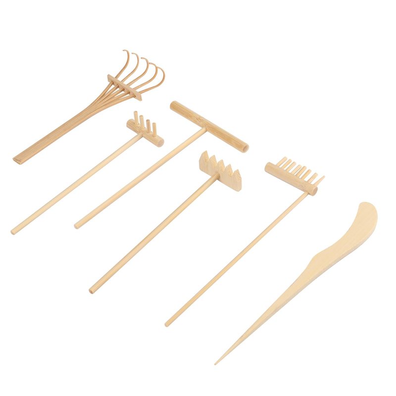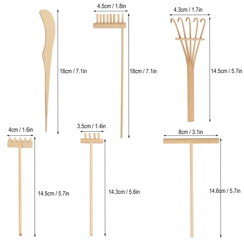 At GNIEMCKIN, we believe that finding inner peace and tranquility should be accessible to everyone. Our DIY sand Zen garden tool set is designed to help you create a serene environment in your home or office that promotes relaxation, mindfulness, and creativity. Our high-quality and professional original Zen garden tool set is perfect for those looking to enhance their meditation and relaxation practices or to add a touch of peace and harmony to their living or work space. Product Details: Material : Bamboo Quantity: 5 sets x 6 Pcs , 30Pcs in total Size : Bending Teeth Rakes : 5.7 inches (Length) Four-Teeth Rakes : 5.7 inches (Length) Triangle Shape Teeth Rakes : 5.7 inches (Length) Pushing Sand Rakes : 5.7 inches (Length) Spinning Rakes : 7 inches (Length) Drawing Styluses : 7 inches (Length)