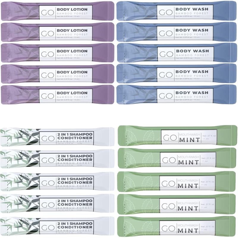 - Handy Pack of 20: Each purchase gives you 20 individual packets 5x of each of GO Essentials Travel Size Shampoo and Conditioner Packets, Travel Size Body Wash Packets, Travel Body Lotion and Mouthwash enough to last through you multiple trips and or for your whole family. Our single-use 2:1 Shampoo and Conditioner packets come in compact, leak-free, and robust packaging :muscle: making them ideal for both personal use and professional use.