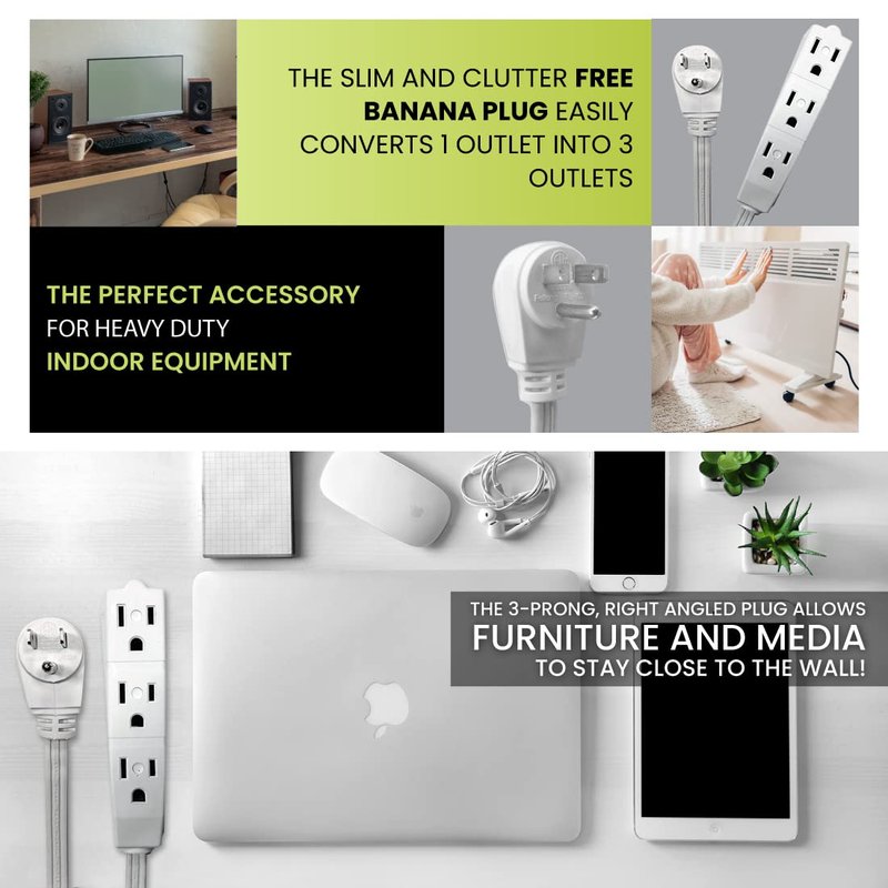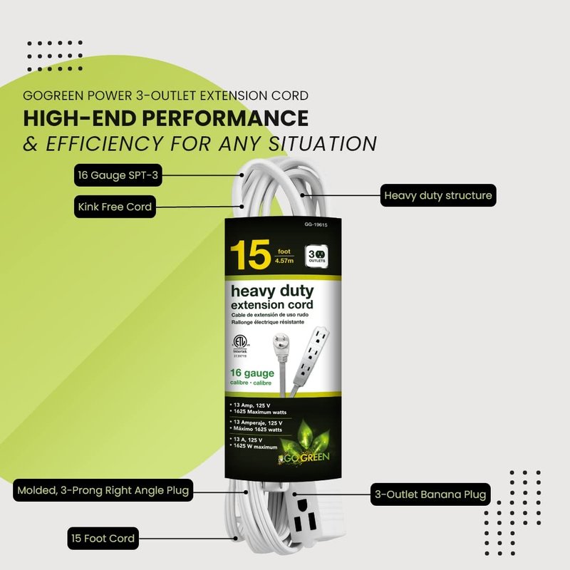 Go Green Power 15' Extension Cord, 3-Outlet, 16 AWG, White (GG-19615)