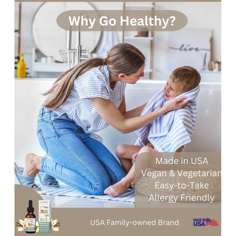 Introducing Go Healthy Natural Kids Liquid Vitamin D3 K2 drops - a vegan and vegetarian suitable vvitamin liquid. Go Healthy Kids Vitamin D3 helps support children's immune system, calcium absorption and strong teeth and bones. Go Healthy Natural plant-based kids liquid vitamin D3 is sourced from Lichen. Vitamin K2 plays an important role in getting calcium to kids bones and teeth. Our childrens liquid vitamin D is easy to swallow and gentle on little tummies. Our vegan vitamins for kids and vegan toddler vitamin options are perfect for families with dietary restrictions. Go Healthy offers a range of food supplements to help support your child's overall health and wellbeing. Our vegan kids liquid multivitamin is a good option for parents who want their children to thrive. Order now and experience the benefits of our kids vitamin drops and vegan vitamins for yourself! Our allergy friendly D3 + K2 liquid contains: NO animal derivatives, gelatin, lanolin, GMOs, gluten, peanuts; No: artificial preservatives, colors or flavors, soy, eggs, milk, yeast, wheat, gluten, fish or shellfish. (allergy warning: *Does contain coconut oil*)