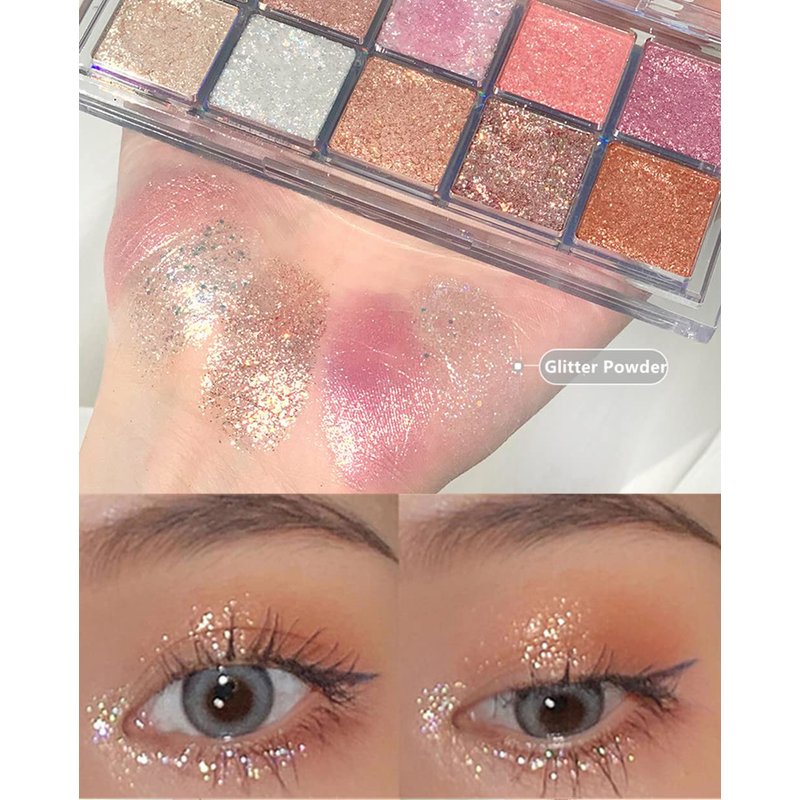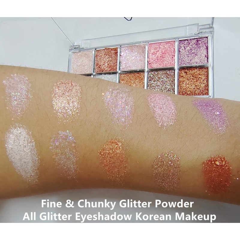 - 【10 Colors Shimmer&Glitter Powder Korean Makeup Palette】Fine Laser Flash Powder and Chunky Glitter-shaped Combination for Korean Eye Makeup,make you stand out from the crowd.This eyeshadow palette contains 10 colors shimmer and glitter pigments and shades.It is glitter powder texture,not loose and soft,smooth.