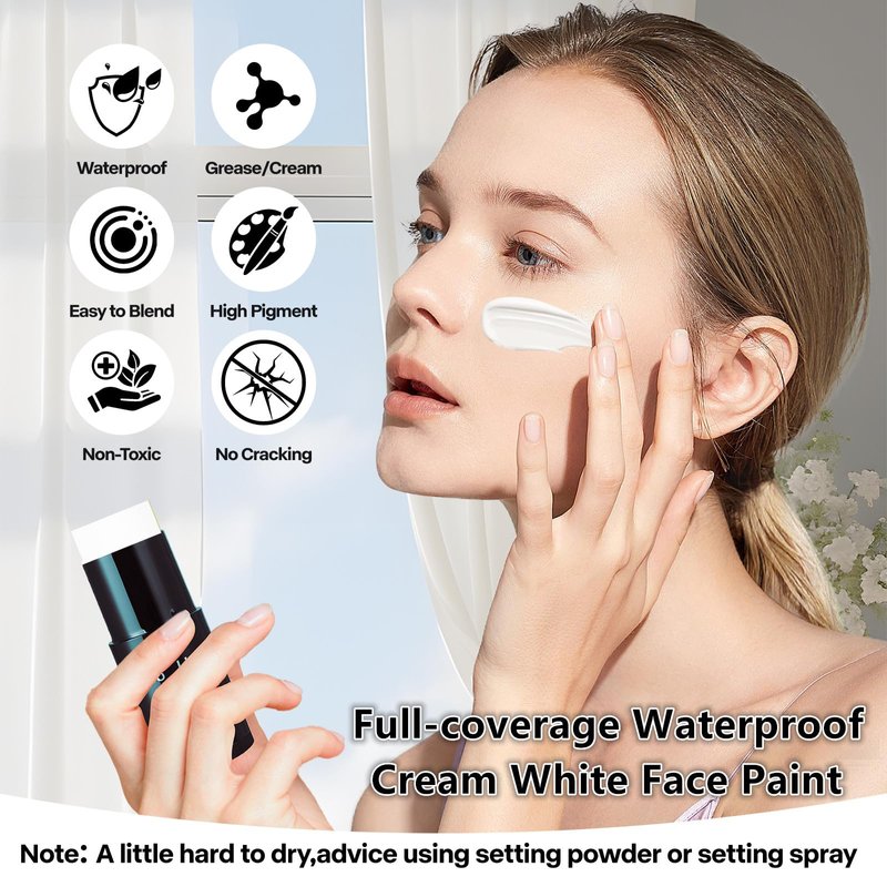 • 【Oil-based Cream White Face Body Paint】1.06 oz white face body paint stick with a matte creamy formula.Waterproof and good coverage white face paint.Go on smooth.Easy to blend.No cracks and flakes.No fading.No splotchy and patchy.No stains.Waterproof,great for white Eye Black Sports.