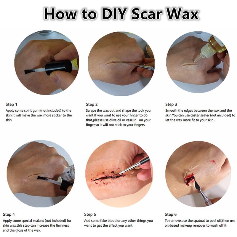 - Easy to DIY FX Makeup & Remove:Apply some spirit gum (not included) to the skin.It will make the wax more sticker to the skin.Scrape the wax out and shape the look you want.Smooth the edges between wax and skin.Use caster sealer (not included) to let the wax more fit to your skin.Apply some special sealant (not included) for skin wax,this step can increase the firmness and the gloss of wax.Add some fake blood to get the effect you want.To remove,peel off,use oil-based makeup remover to wash off.