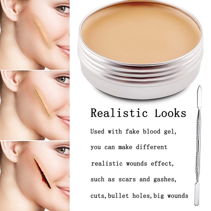 - Fake Molding Wound Skin Scar Wax Kit --- Easy to shape to any realistic looks you can imagine.Scars and gashes,cuts,bullet holes,big wounds,bites,burns,blisters,fast lips,broken nose,bumps,torn face,prosthetics makeup,zombie makeup and any kinds of special effect sfx make up you want.The color of the wax is nearly the same to the human skin,matched and kind to most of skin tones.It seems like you have injured but just need some moment to finish that and to scar your friends.