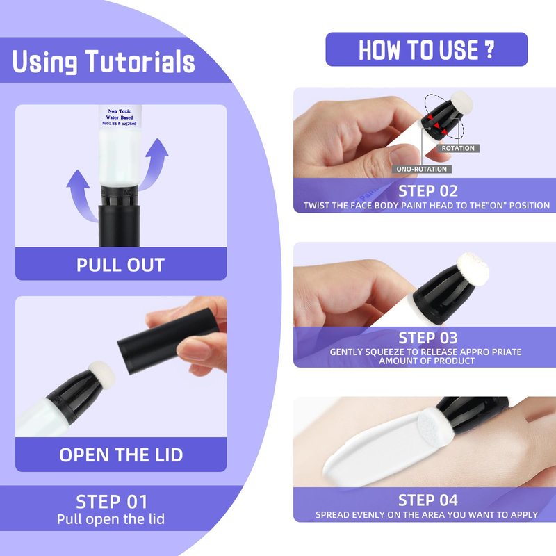 - 【Easy to Control & Easy to Remove】Good for face and full body painting.The cushion applicator ensures a clean and controlled application of the liquid body paint. It allows for precise and smooth strokes, preventing any messy spills or smudges during use.Easily wiped off just by water.