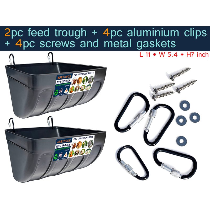 - 🐐SET INCLUDES: 2pack feed trough,4pcs Clip,4pcs Pointed head screws, can be suspended from wire mesh, as well as mounting on fences or walls, very easy to use.