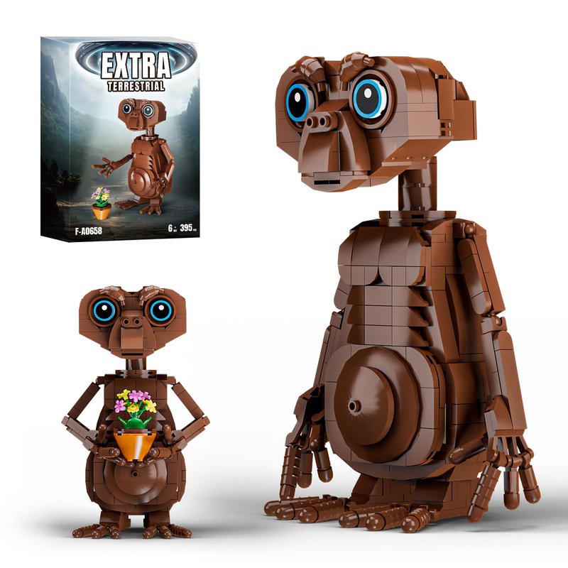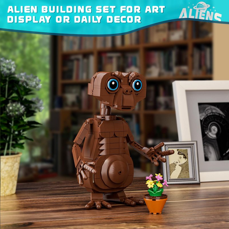 Explore the whimsical world of Extra Terrestrial with this delightful building block set. Assemble a charming robot figure with expressive eyes and movable limbs, complete with a blooming flower pot it lovingly tends to. At 395 pieces, this set offers an engaging building experience for all ages. Let your imagination soar as you bring this endearing scene to life, piece by piece. The perfect addition to any collection or a delightful gift for the creative mind.Bring the magic of cinema into your home with the E.T. Alien Bricks Model Building Block Set. Based on the beloved extraterrestrial character from the 1982 classic E.T. the Extra-Terrestrial, this high-quality building set allows you to create an incredibly detailed and lifelike model of the iconic alien. With its expressive eyes, distinct long fingers, and recognizable features, the set captures the heart and soul of one of the most endearing movie characters ever created.