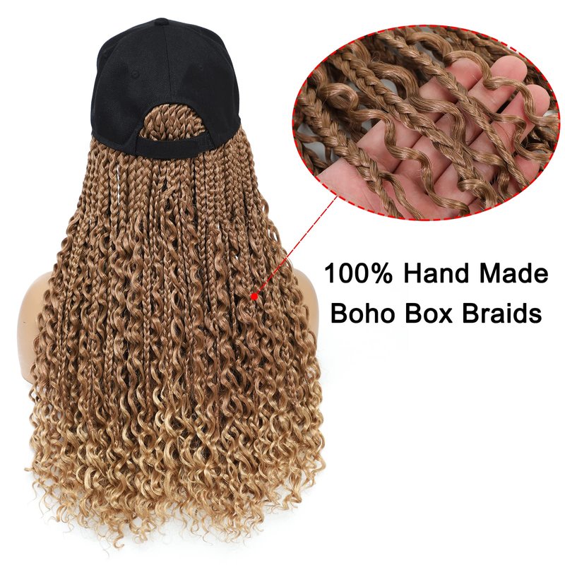 - Braided Hair Wig Material: The braided hat wig is made of high quality hand-made boho box braids with a baseball cap. It is fashion, natural and fascinating. Different colors available for making choice. Hat with Crochet box braids are relatively low maintenance and are a great style for your every day look.