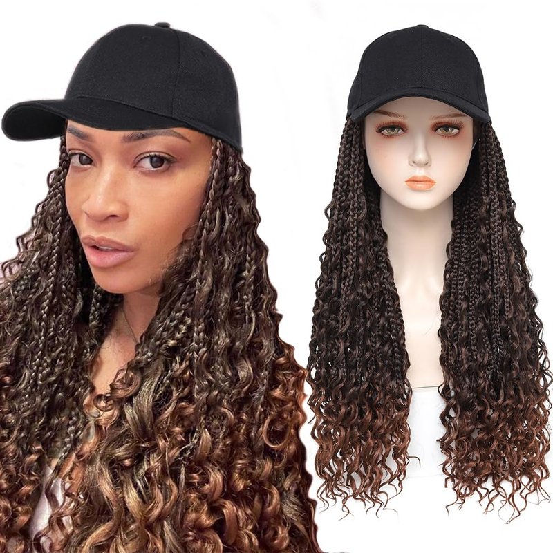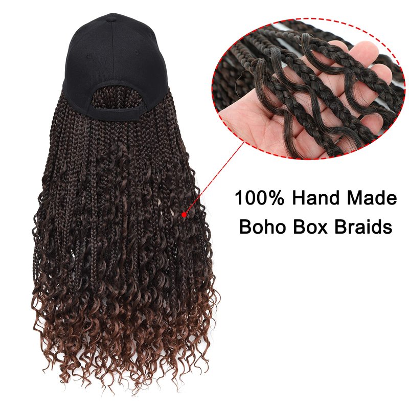- Braided Hair Wig Material: The braided hat wig is made of high quality hand-made boho box braids with a baseball cap. It is fashion, natural and fascinating. Different colors available for making choice. Hat with Crochet box braids are relatively low maintenance and are a great style for your every day look.
