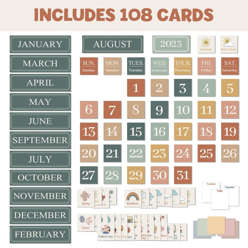 - 108 Total Pieces: This Boho calendar display comes with easy-to-read number pieces, colorful monthly headers, seasons and weather pieces and additional pieces for holidays and special occasions as well as pieces for yesterday, today, and tomorrow and customizable dry-erase cards.