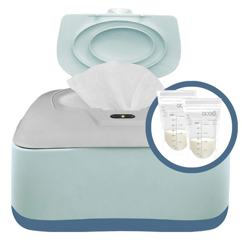 GOGO PURE Baby Wipe Warmer, Dispenser, Holder and Case with Bonus 30 Breastmilk Storage Bags - Warmer with Easy Press On/Off Switch, Great Combination, Great Baby Gift (Blue/Grey)
