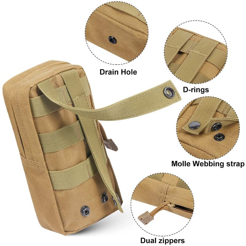 FEATURE 【Package Included】2 tactical pouches and Water Bottle Pouch Holder, can be attached to tactical vest, camping/ hiking backpack or other equipment with MOLLE system 【Size of Pouch】Approx 6"H x 5"L x 3"W, perfect for storing cell phone, tactical pen, keychain, GPS device, digital cameras, medical supplies or any necessary gadgets you need 【High Quality】The pouch is made of 1000D nylon material and the quality is better than most of the other 600D molle pouch. More wear-resisting and more durable 【How to Use】Molle pouch has 2 buckles on the back that can be attached as an extra external pouch to a tactical backpack, combat vest or other tactical gear, or even your suitcase, or can be used as a regular pouch PACKAGE INCLUDED 2 x Tactical Pouches, 1 x Water Bottle Pouch Holder
