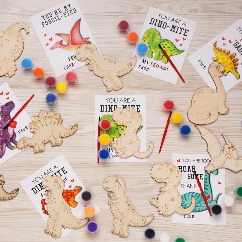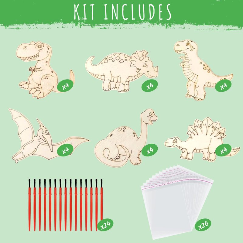 - Package Includes: The dinosaur party favors for 4-8 feature 24 dinosaur thank-you cards, 24 dinosaur wood signs (6 unique designs), 24 3-color watercolor paints, 24 painting brushes, and 26 clear bags.