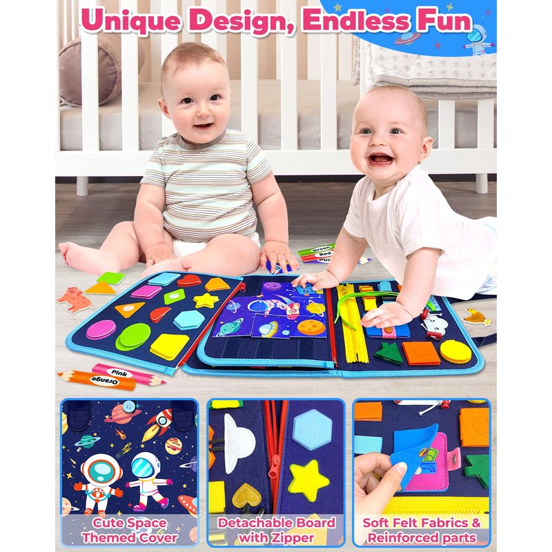 - Endless Fun Learning Toy: This busy book for toddlers 1-3 is based on Montessori education theory to design, helping children to develop a lot of skills, including basic life skills, fine motor skills, hand-eye coordination, thinking ability and problem solving ability, etc. Your little loved ones will have countless entertainment while playing this colorful activity board!