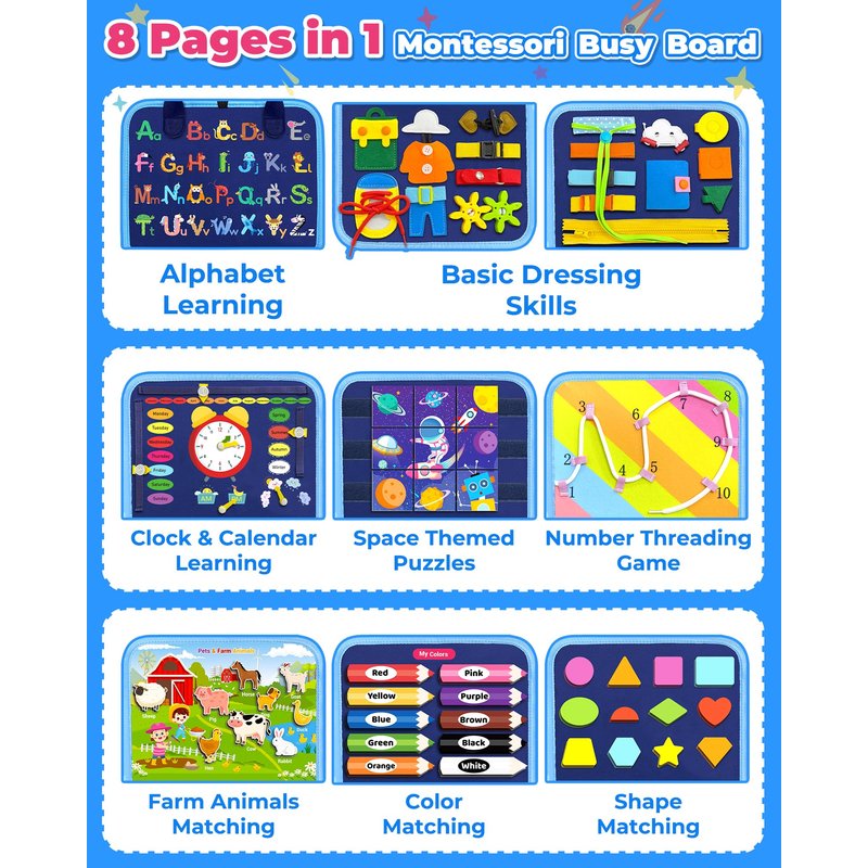 - 8 Pages in 1 Montessori Busy Board: Based on the traditional busy board with 2 simple pages, we designed this Montessori busy board with 8 pages for toddlers to play. Over 30 different learning activities for little ones to exercise, such as zippers, shoelaces, buttons, alphabet learning, shape matching, color matching, animal puzzles, clock & calendar learning, farm game, threading game, etc.