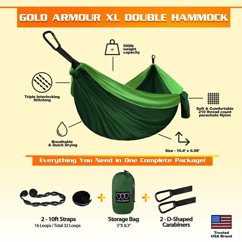 Gold Armour Camping Hammock - Extra Large Double Hammock Portable Hammock Camping Accessories Gear for Outdoor Indoor with Tree Straps, USA Based Brand