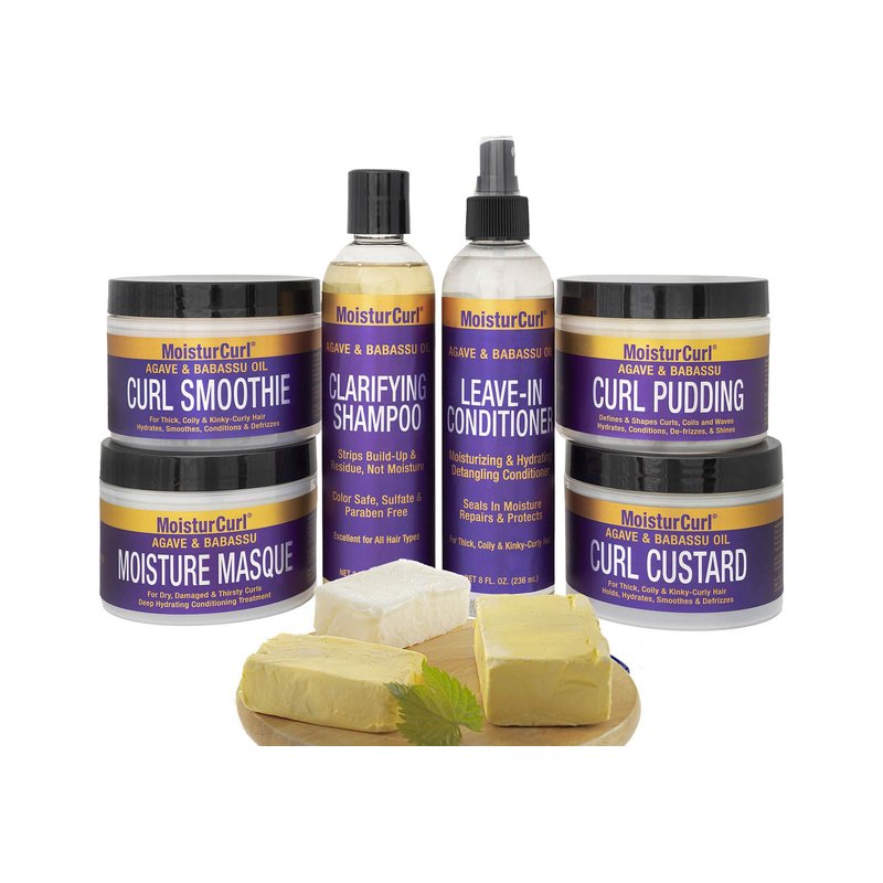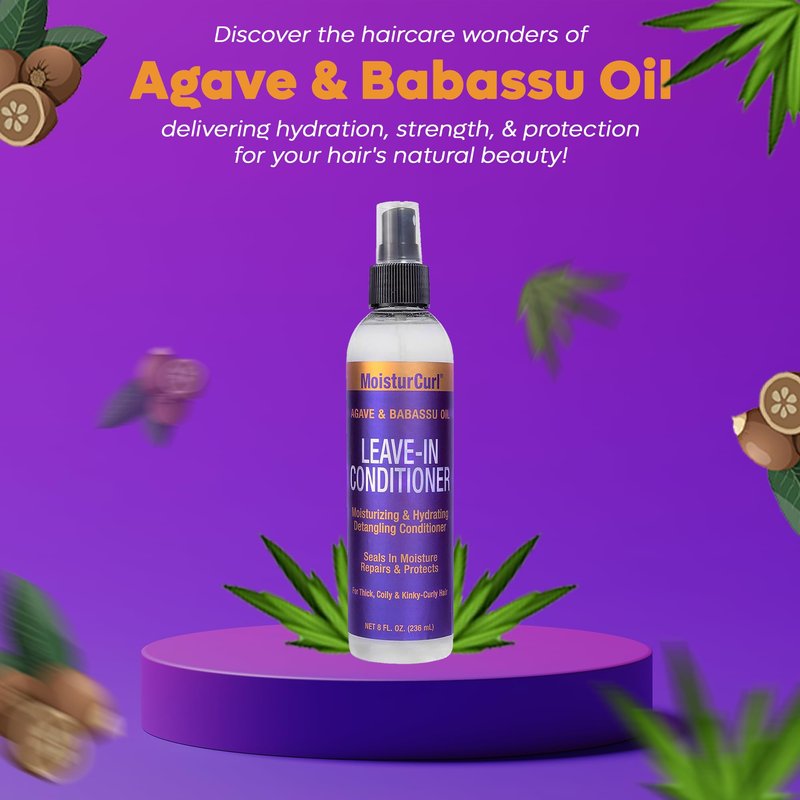 MoisturCurl Leave-In Conditioner is the perfect hydrating Leave-In Conditioner for thick, coily and kinky-curly 3c-4b hair. Our slippery formula instantly moisturizes, softens and conditions, while loosening tangles and knots. MoisturCurl works holistically as a multi-step daily hair care regimen for all curl types. This 100% natural curl care system conditions the hair and scalp. Adds moisture, hydration and curl definition to every hair texture. You can trust MoisturCurl in each step of your hair styling routine, with products that are safe and can be mixed and matched depending on your styling preferences. Formulated with Agave and Babassu Oil. The Agave plant is native to Mexico, a soothing hair humectant that adds moisture and shine. Babassu oil comes from the Amazonian palm fruit, which is rich in vitamins and emollients that improves hair and scalp health.