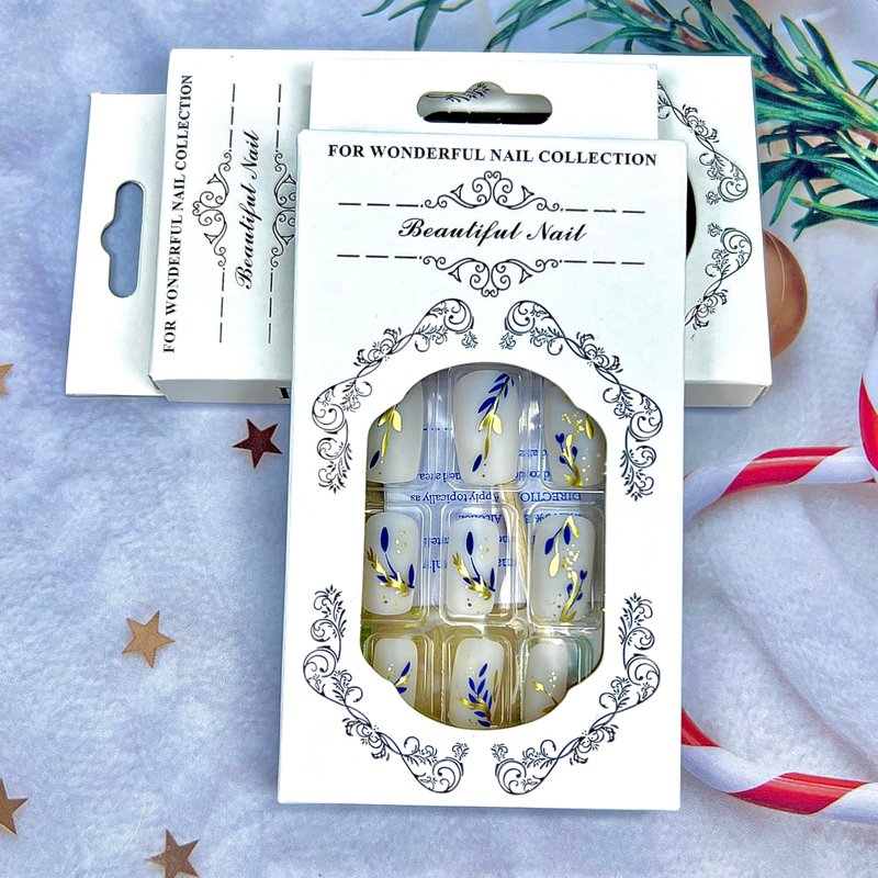 - Packaging includes:You will receive 24 gold blue leaves fake nails, 24 jelly glue, 1 small wooden stick, alcohol bag, nail file, no additional tools required.