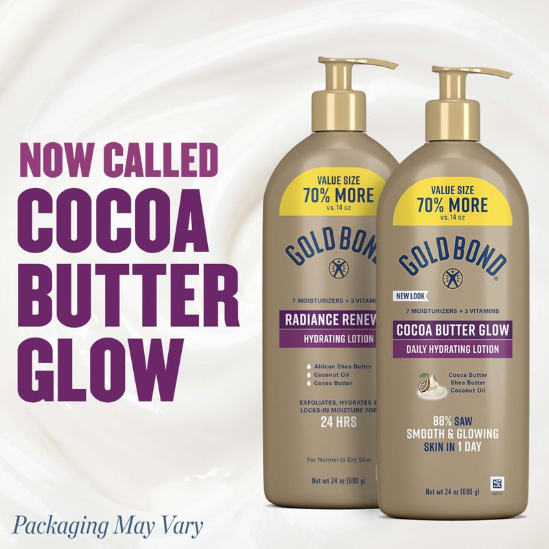 - Contains: One (1) 24-ounce pump bottle of Gold Bond Cocoa Butter Glow Daily Hydrating Lotion for dry skin