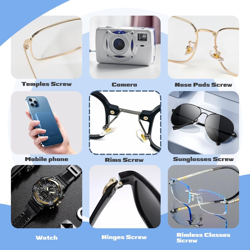 - Exquisite Eyeglass Repair Kits: No matter you want to change nose pad, your glasses screws are aging or missing, you can use this glasses repair kit to solve these problems easily and conveniently. The sunglasses repair kit can be used for eyeglass frames, frameless designs, hinges, sunglasses, watches, clocks, cellphones, small electronics, tiny precise devices,etc.