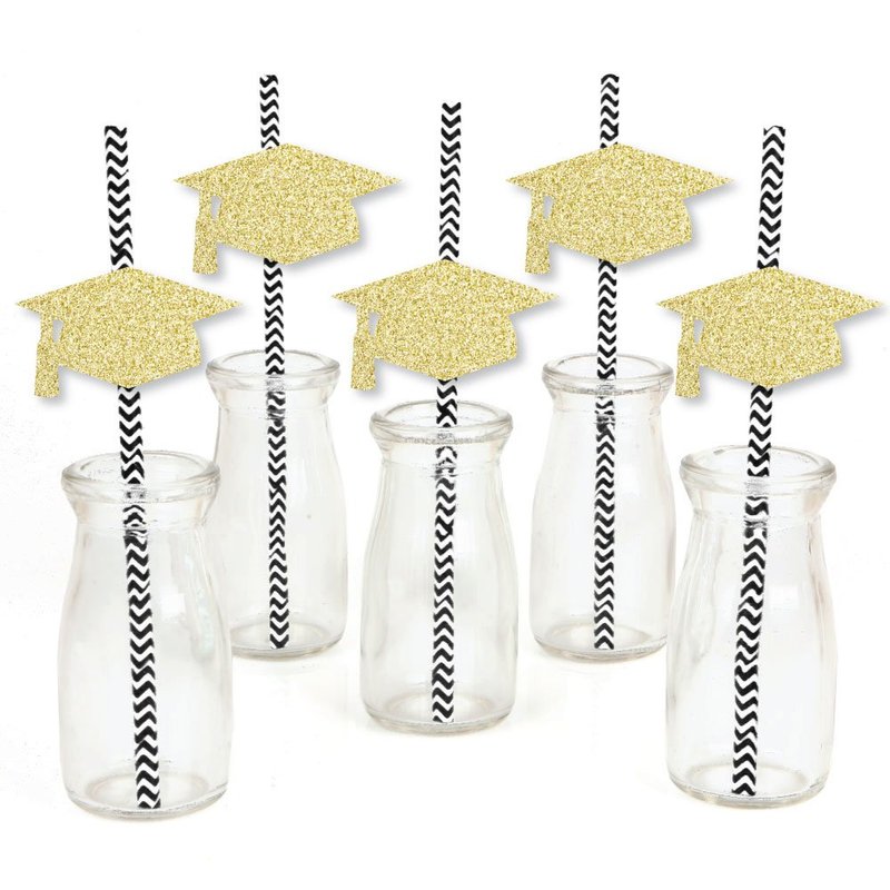 - Gold Glitter Grad Cap Party Straws INCLUDES 24 no-mess real gold glitter cut-out shape grad cap, 25 black party straws and adhesives. Party straw decor is ideal for a graduation party.