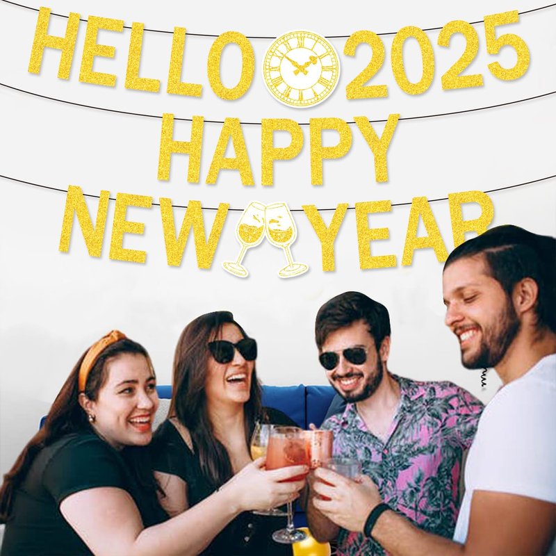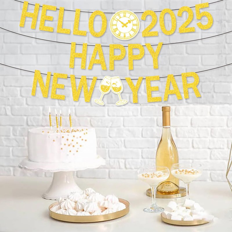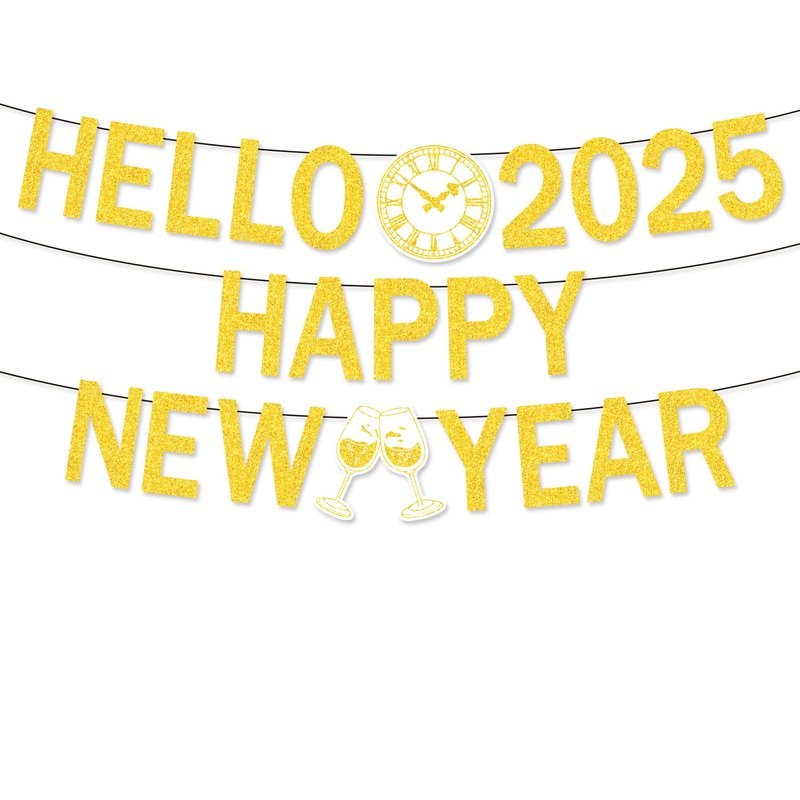 - 【PACKAGE INCLUDE】Requires pre-assembly, 1pcs happy new year banner with wine glass pattern, 1pcs hello 2025 banner with clock pattern
