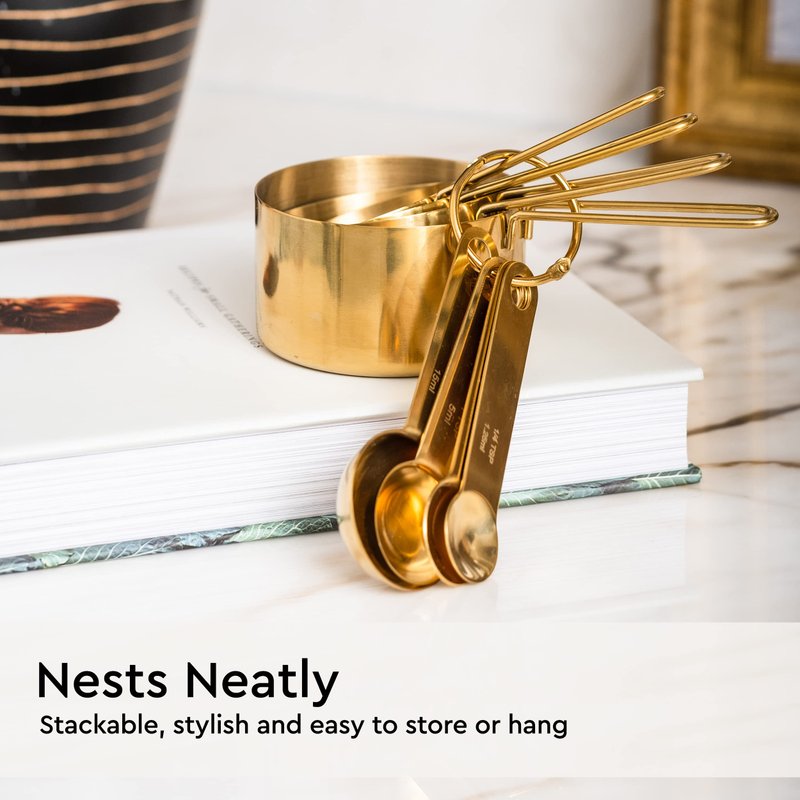 - ✔ MEASURING IS EVERYTHING – Because precision is the key for recipe success and a failure could lie within a single ill-measured tablespoon. Don’t waste your valuable time and money on ingredients only to get a mediocre result. Invest for success and buy your gold measuring cups and metal measuring spoons set now!