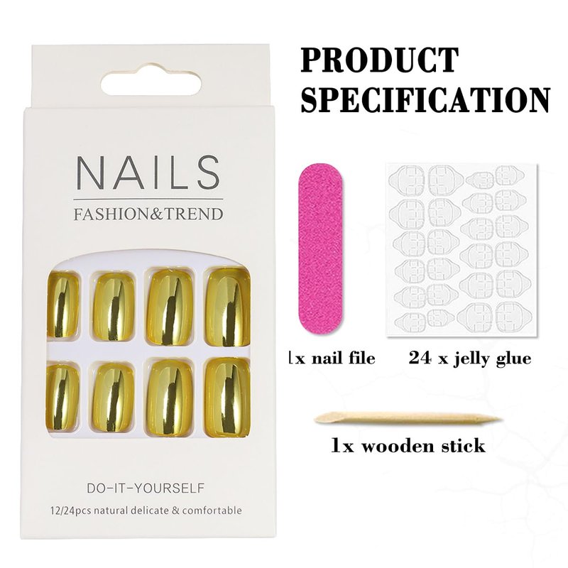 - 𝐏𝐚𝐜𝐤𝐚𝐠𝐞 𝐂𝐨𝐧𝐭𝐚𝐢𝐧𝐬:You will get 1box 24pcs gold fake nail,short design and 12 Sizes, includes prep pad, mini nail file, cuticle stick, jelly adhesive tabs.