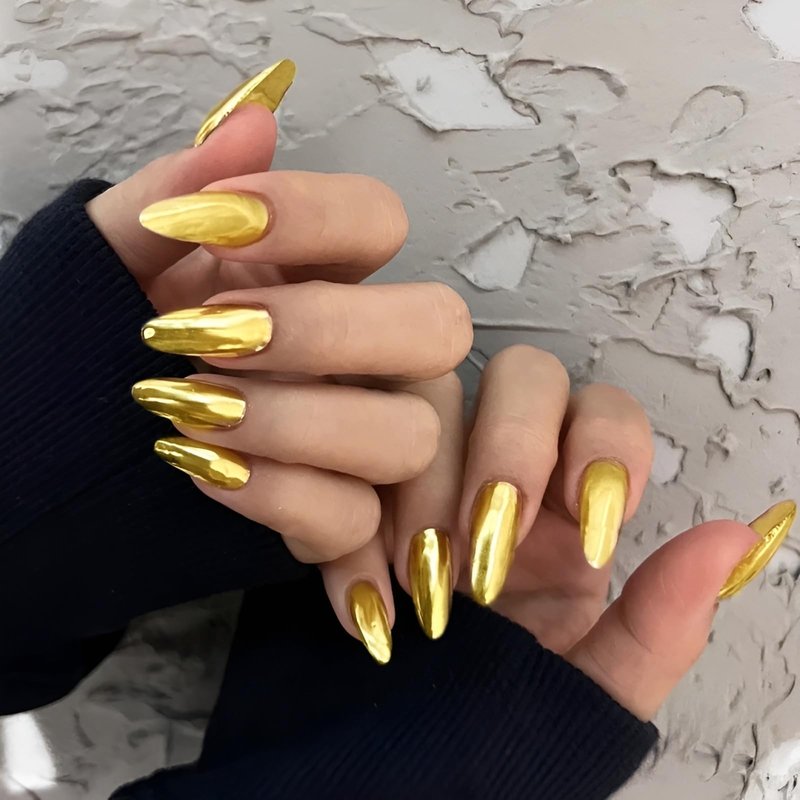 - 【Almond Press on Nails】The package contains 24 pieces of chrome gold fake nails of different sizes, 1 mini nail file, 1 small wooden stick, and 1 piece of nail glue sticker.You can safely choose a fake nail that fits your finger size and DIY your desired nail shape.