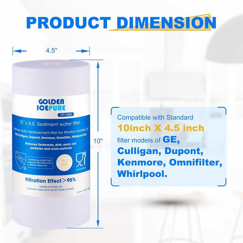 - 【COMPATIBLE MODELS】The filter can be used in any standard 10" x 4.5" heavy duty , icemaker, and Whole House filtration systems. Compatible with American Plumber W10-PR, W15-PR, Aqua-Pure AP801, AP814, AP811, AP817, Culligan HD-950, GE GXWH35F, GXWH30C, GXWH-40L, GNWH-38F, RFC-BBSA, HDSFI, GXWH-35F, DuPont WFHD13001B, Hydronix HF45-10BLBK10PR, DGD series, RFC series, Whirlpool WHKF-GD25, WHCF-WHPLBB, PL10B30.